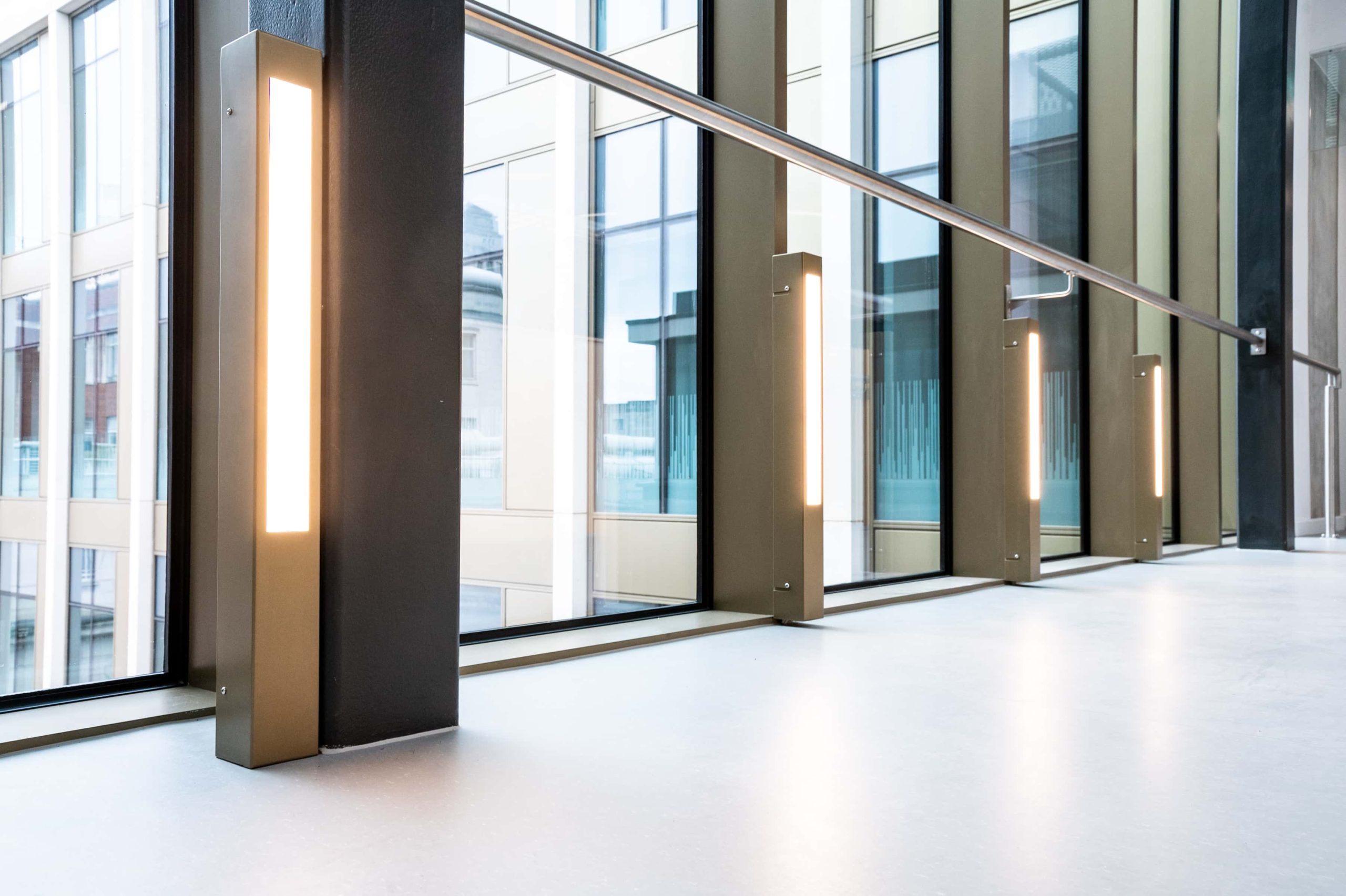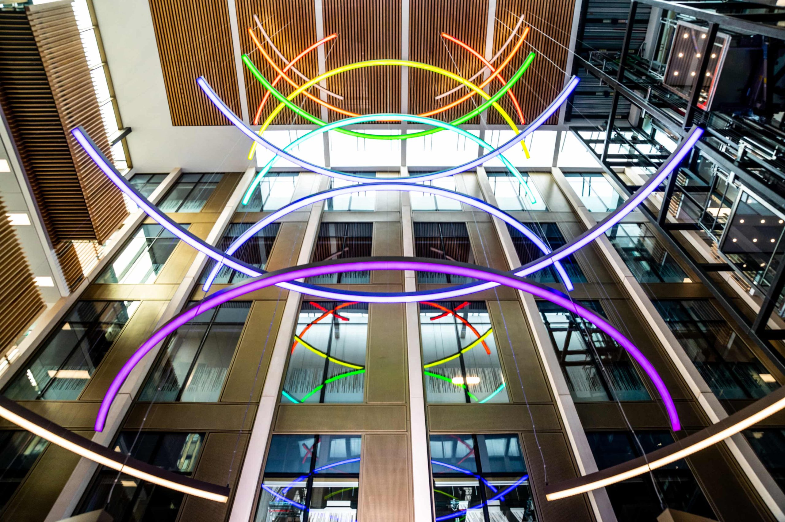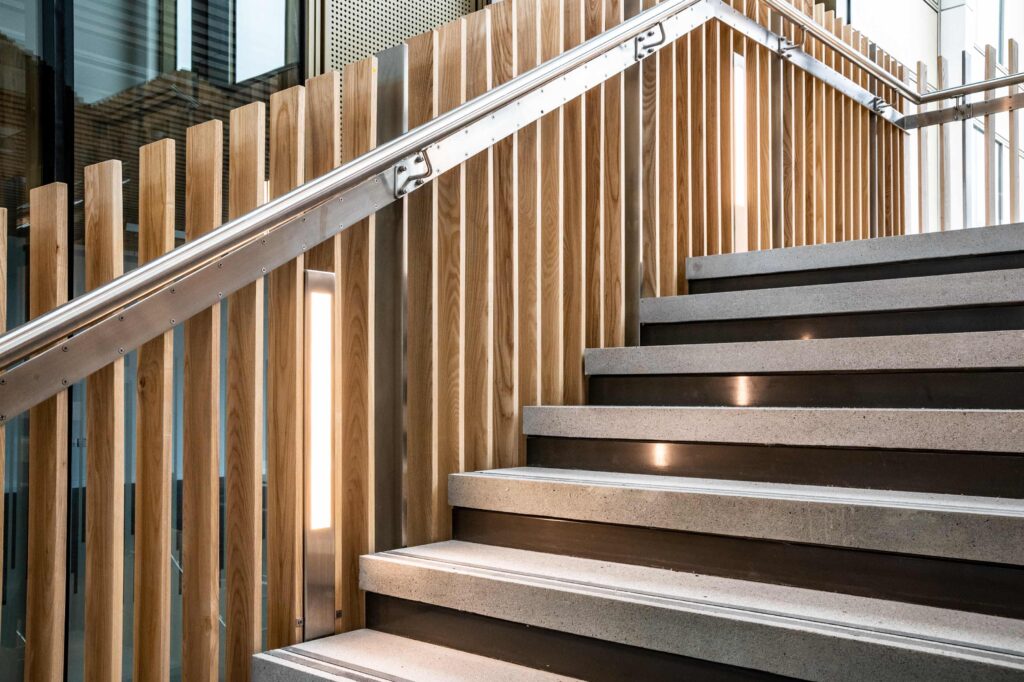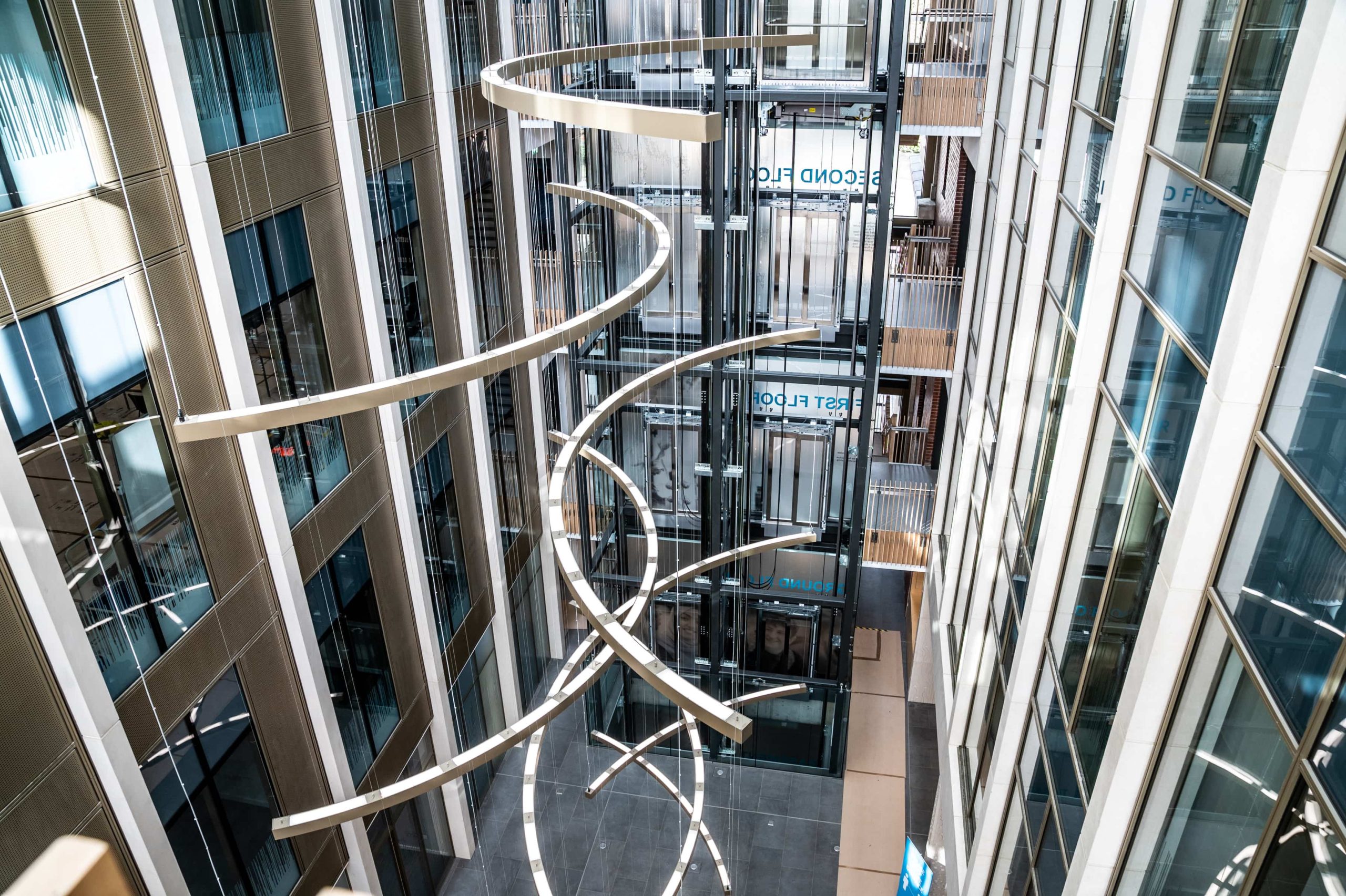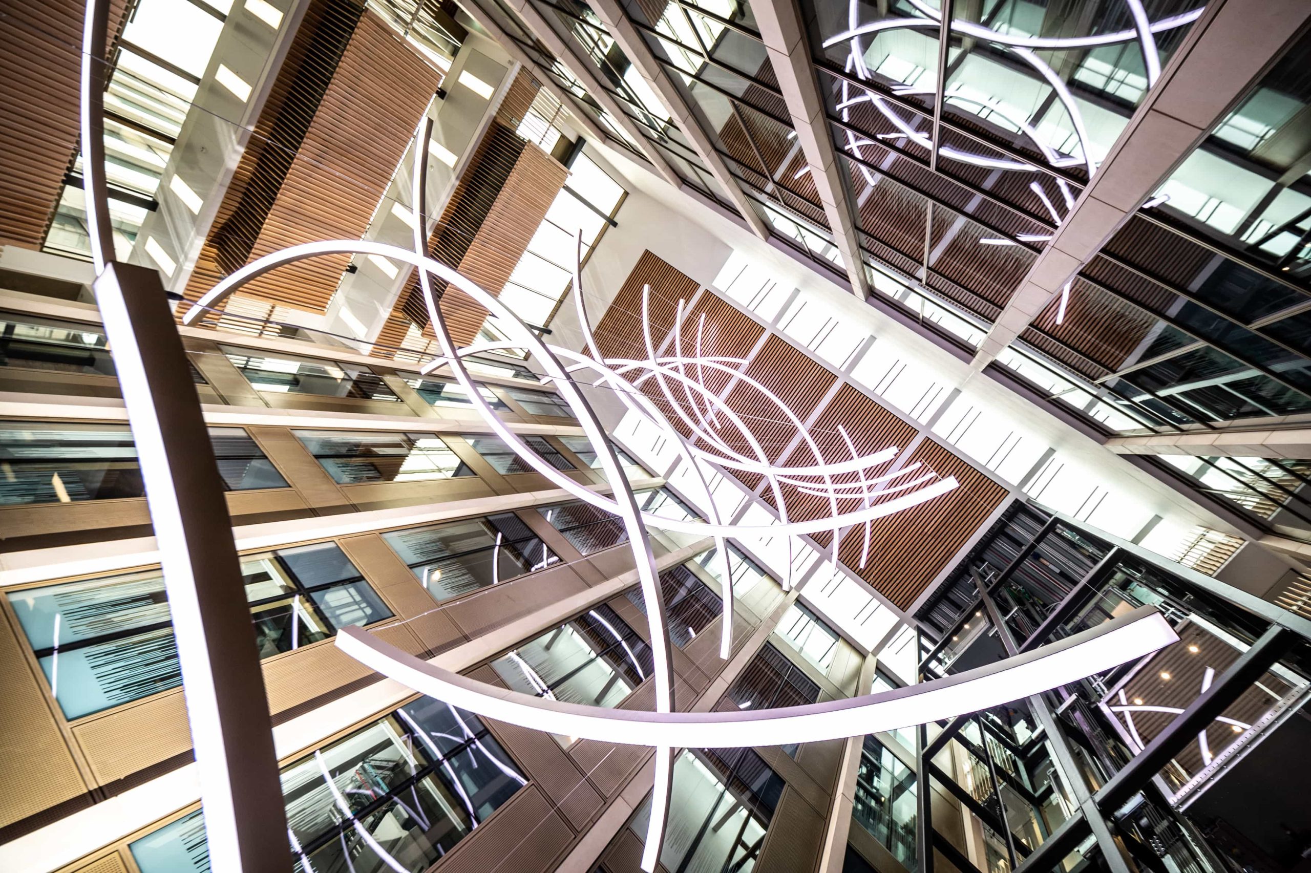 The atrium and stair feature lighting included direct/indirect, and RGBW. The original specification was for DMX control, but there was no DMX control system or DMX cables installed in the building. We needed to come up with a solution to control the atrium lights to enable faster animations. We agreed the stair feature would be controlled via the building control system using DALI. We did the same for all areas except the floor standing fittings.