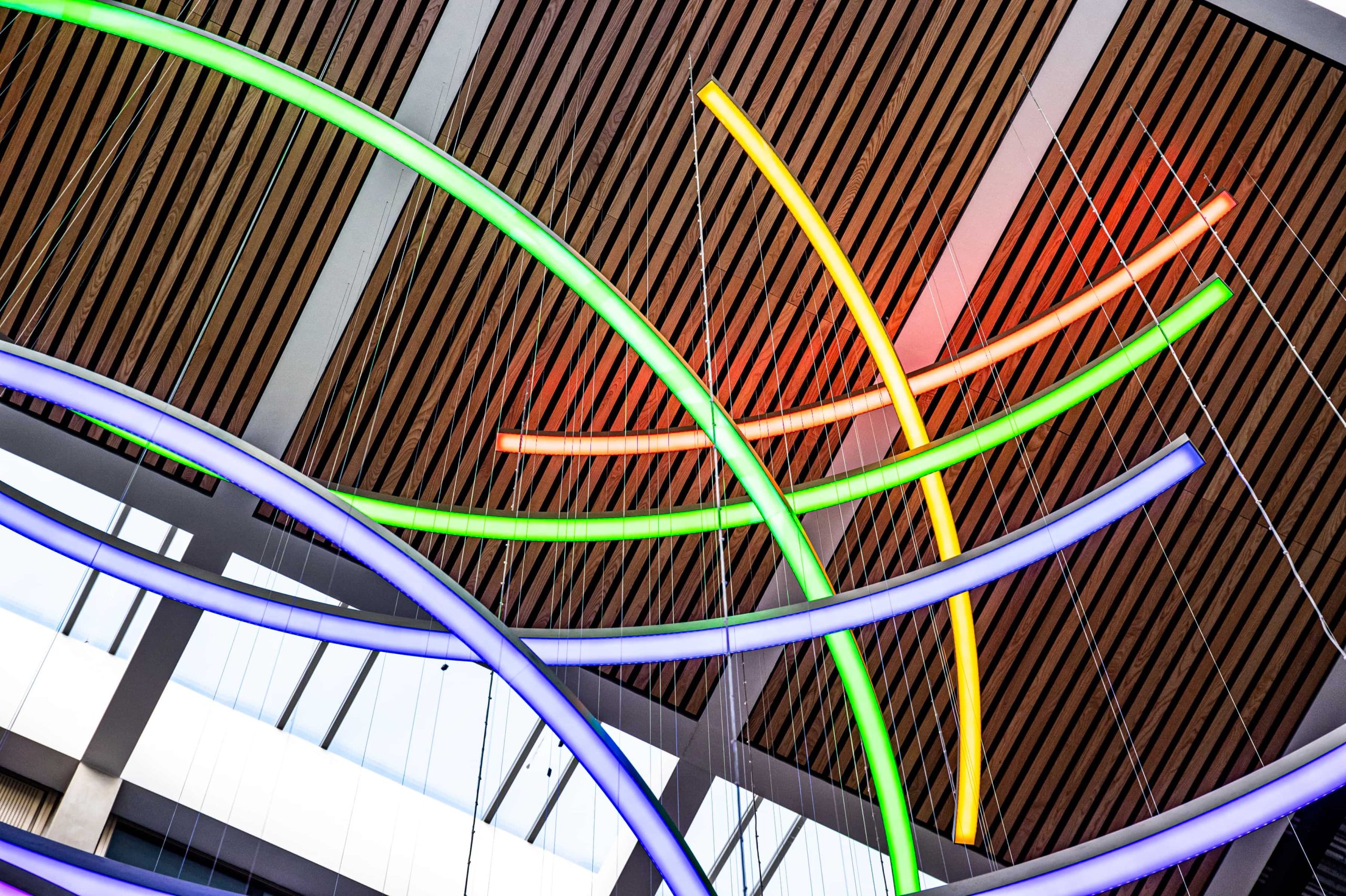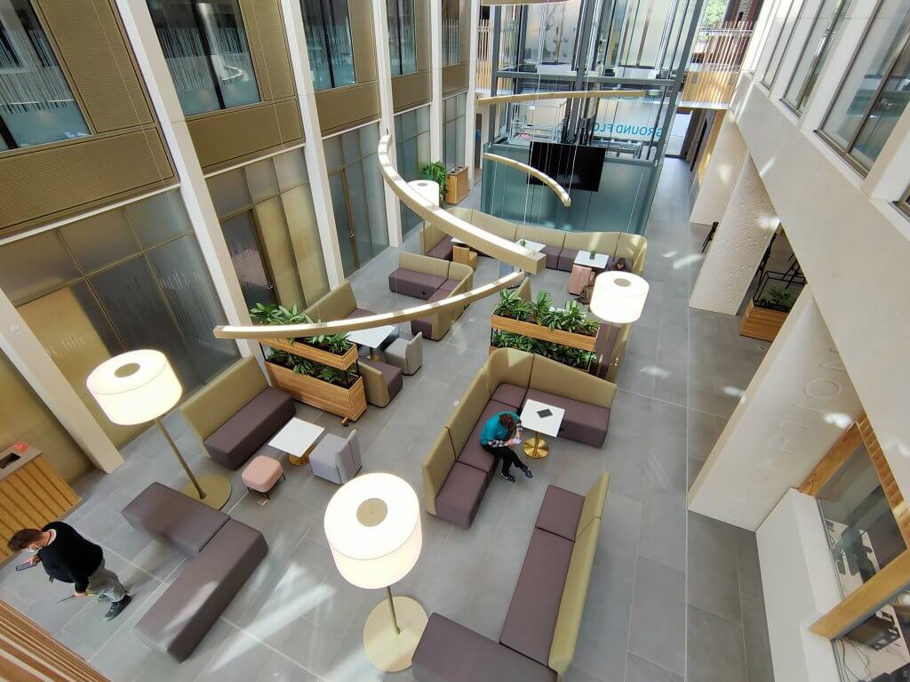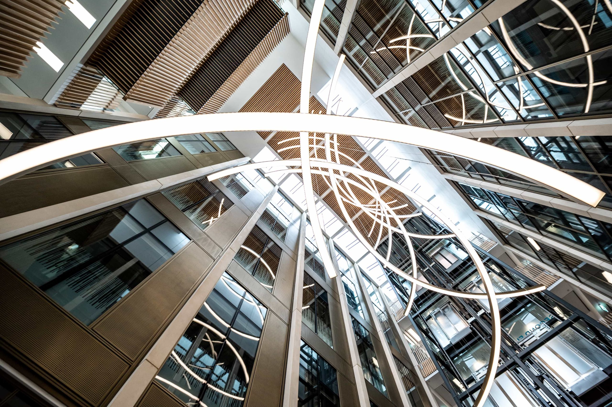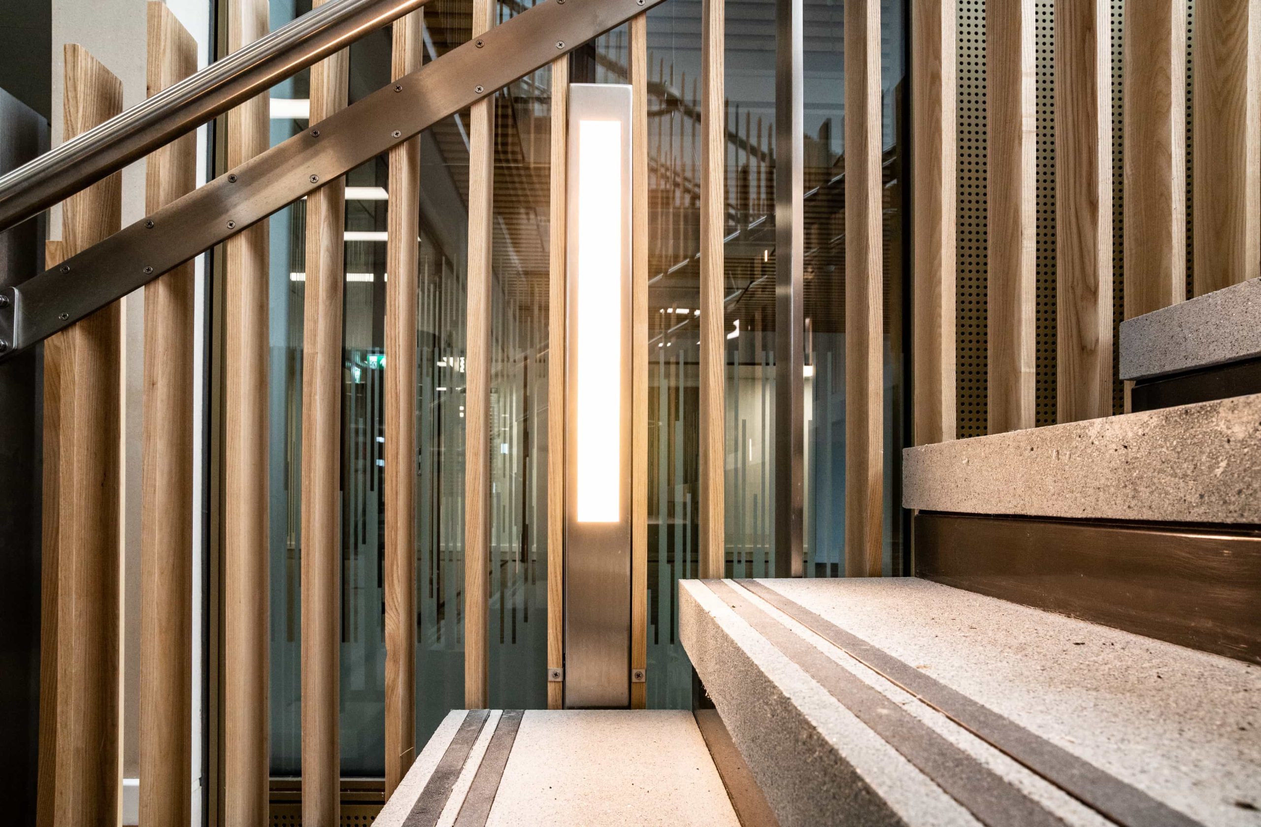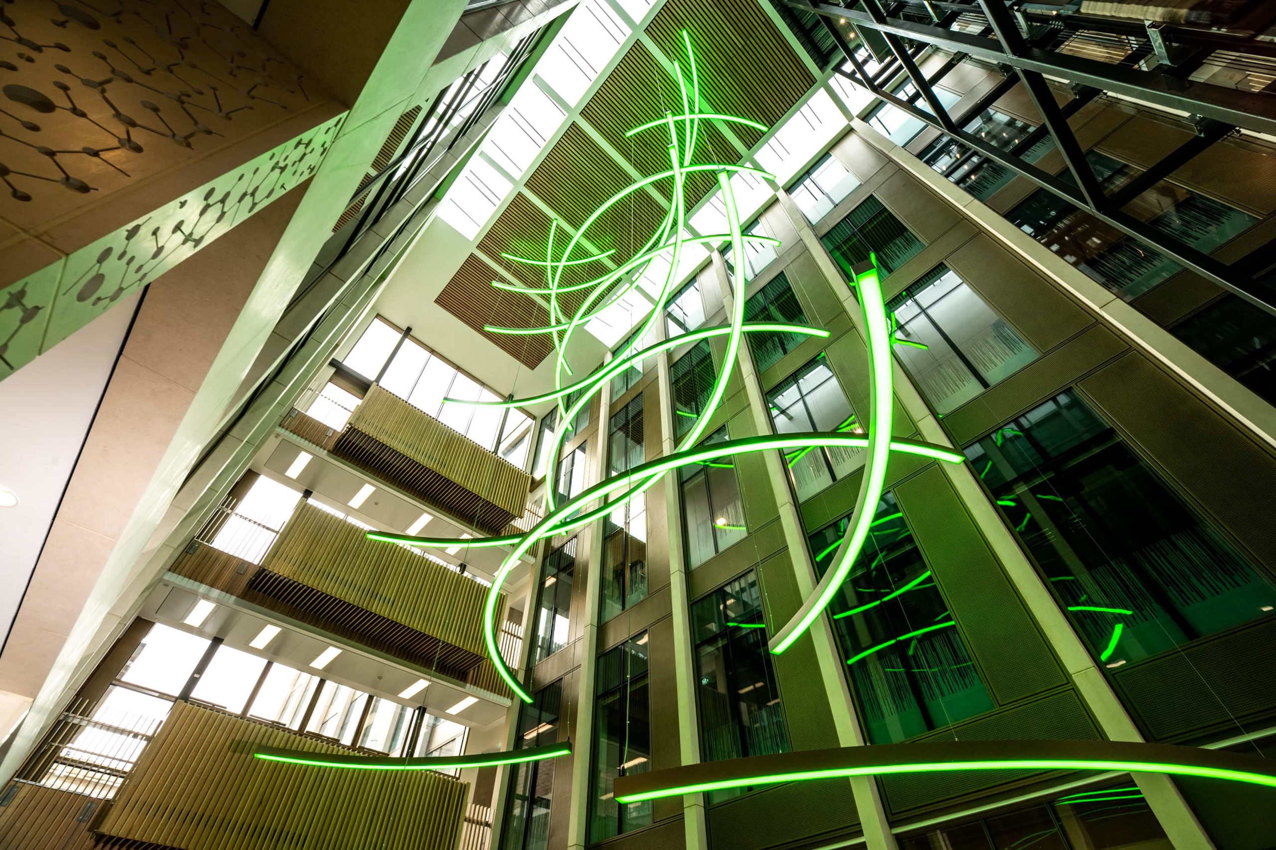 The atrium and stair feature lighting included direct/indirect, and RGBW. The original specification was for DMX control, but there was no DMX control system or DMX cables installed in the building. We needed to come up with a solution to control the atrium lights to enable faster animations. We agreed the stair feature would be controlled via the building control system using DALI. We did the same for all areas except the floor standing fittings.
