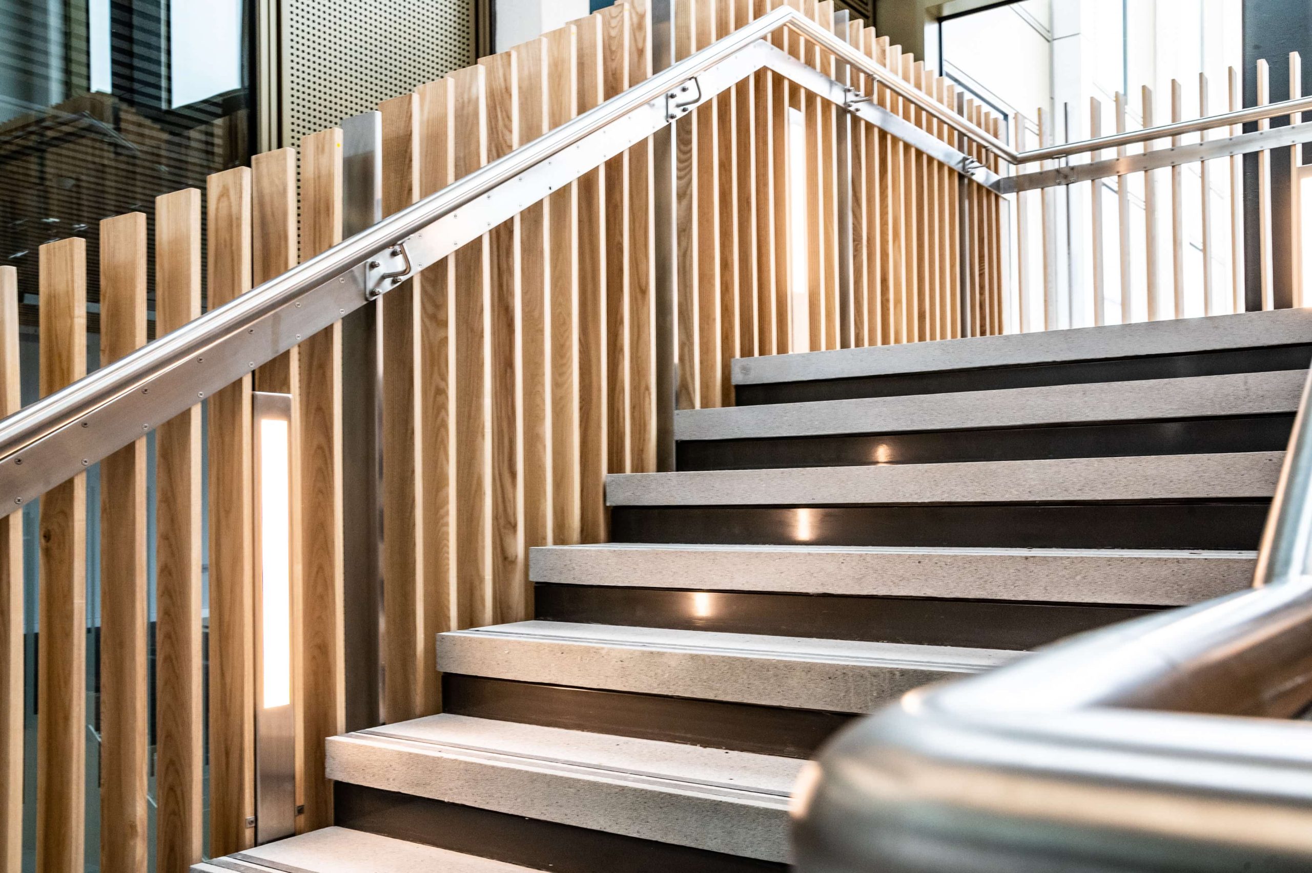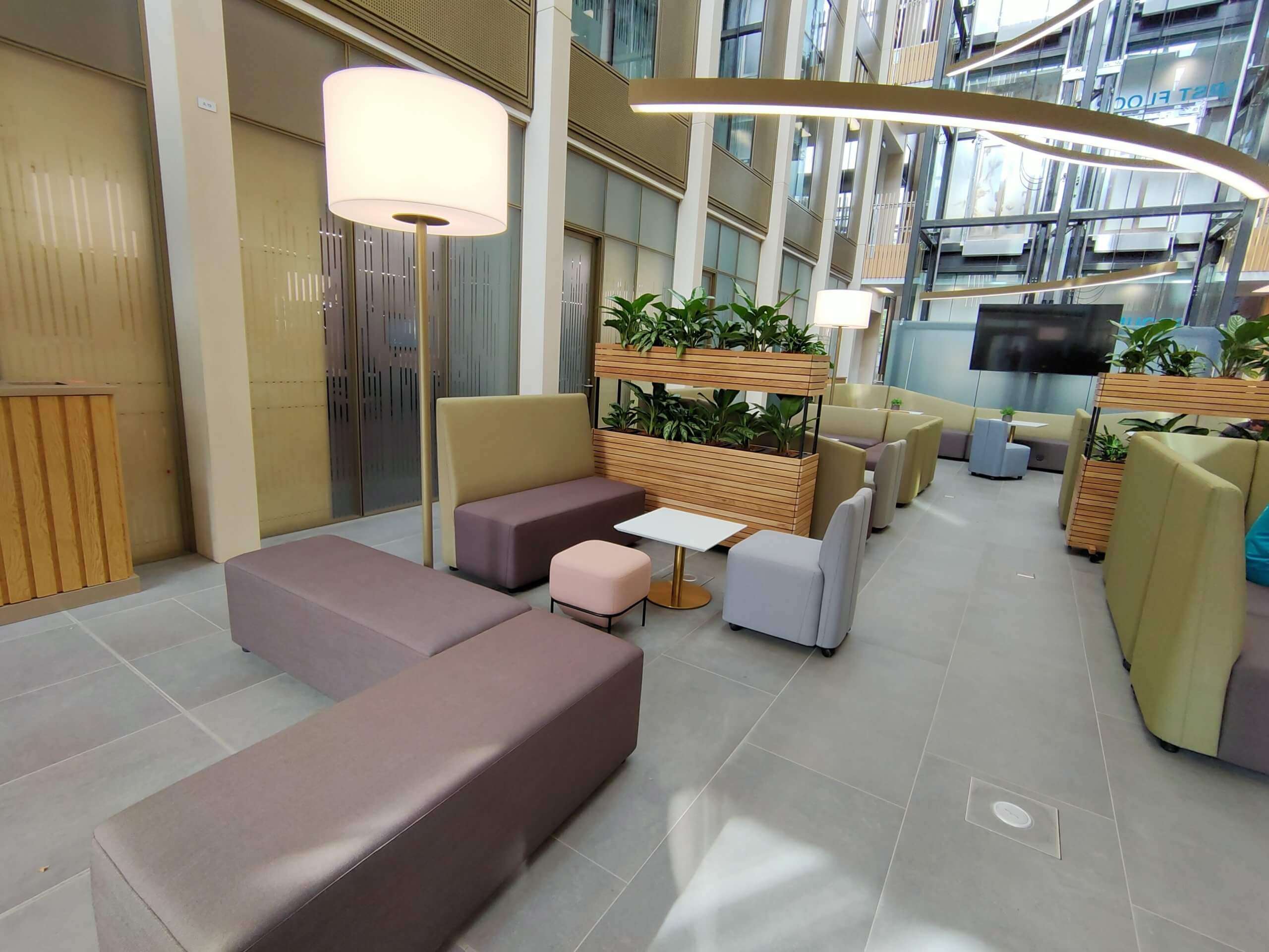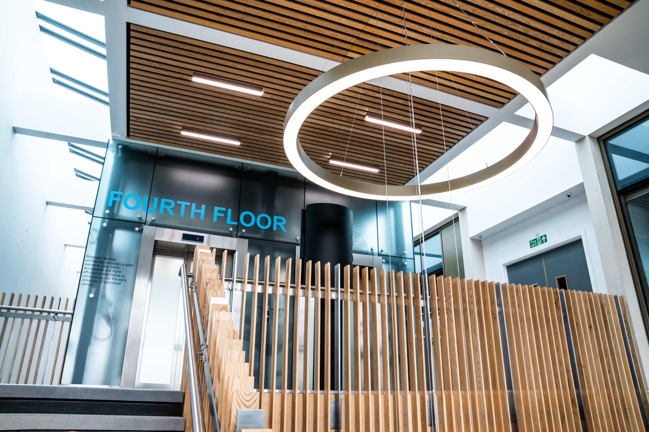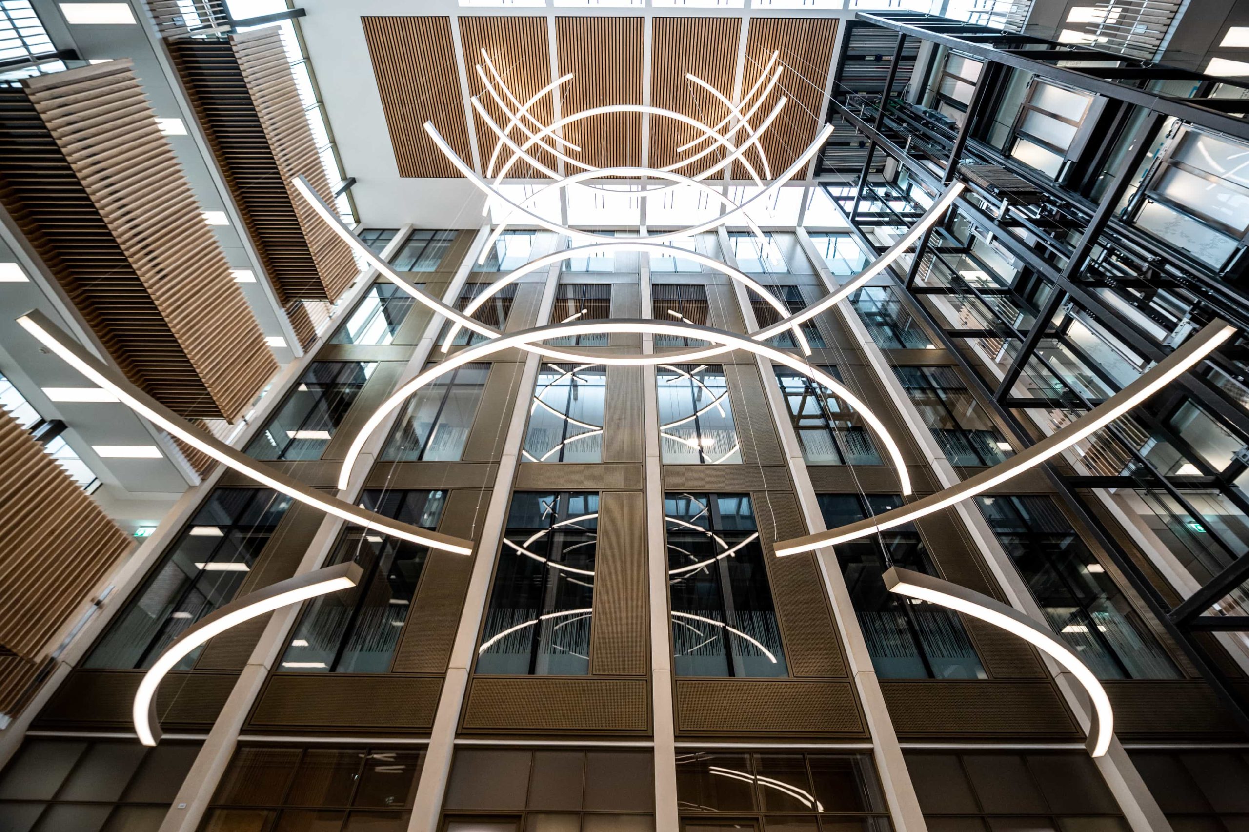 The atrium and stair feature lighting included direct/indirect, and RGBW. The original specification was for DMX control, but there was no DMX control system or DMX cables installed in the building. We needed to come up with a solution to control the atrium lights to enable faster animations. We agreed the stair feature would be controlled via the building control system using DALI. We did the same for all areas except the floor standing fittings.