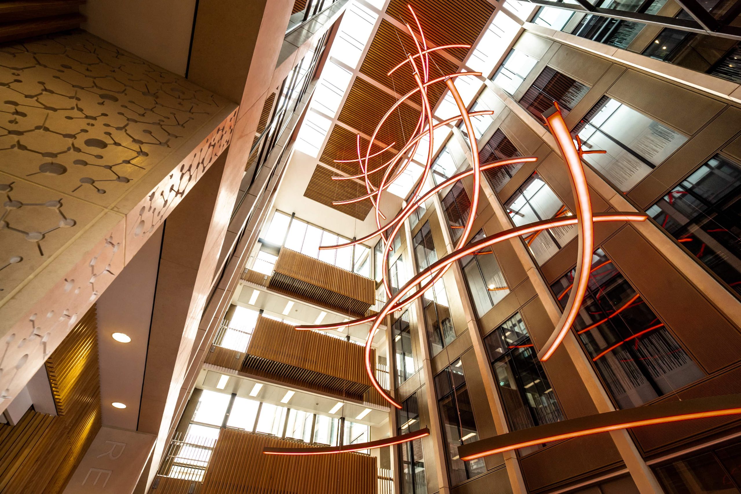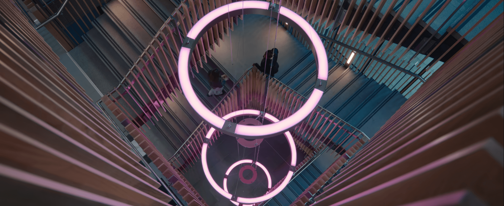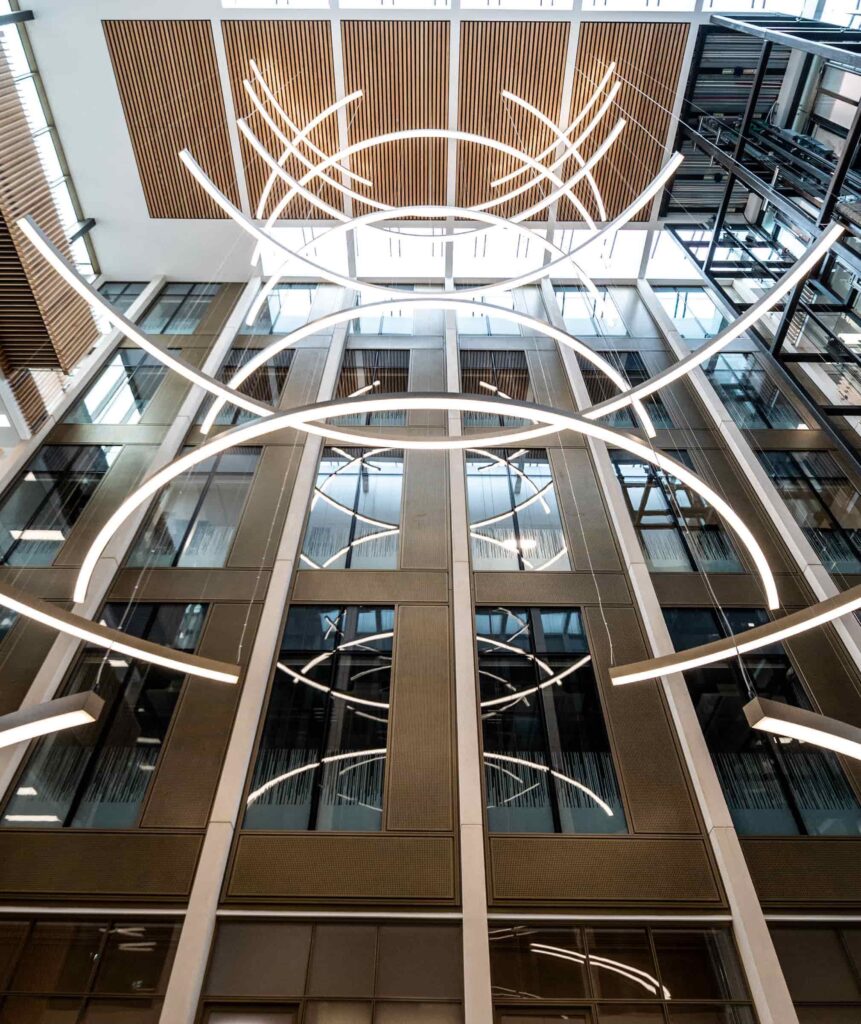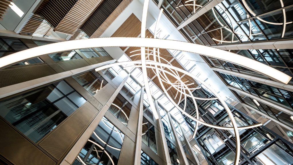 Our solution was to use the standalone DMX system used to control the atrium fittings but splitting into two separate universes; one for the atrium; and the other for the stair feature pendant. We added an interface capable of taking DMX signals and converting to DALI DT8, transmitting to the stair feature pendant via a dedicated DALI cable.