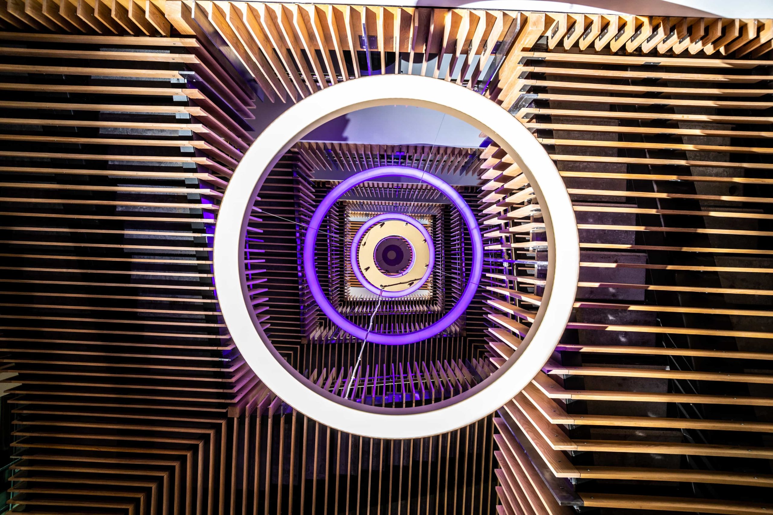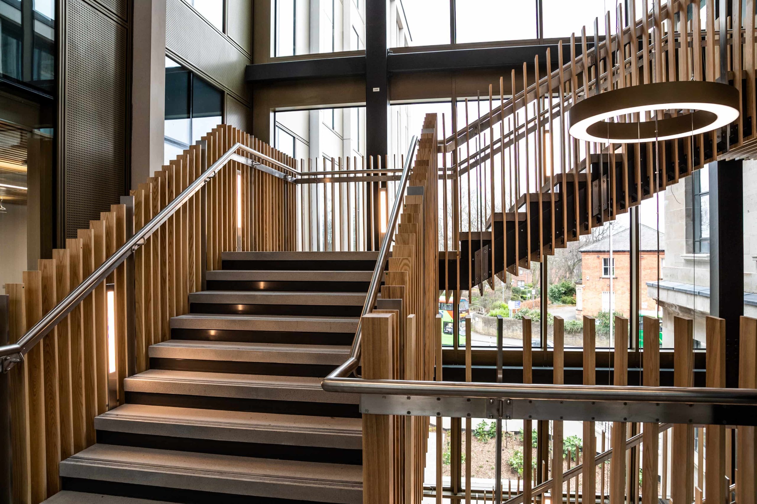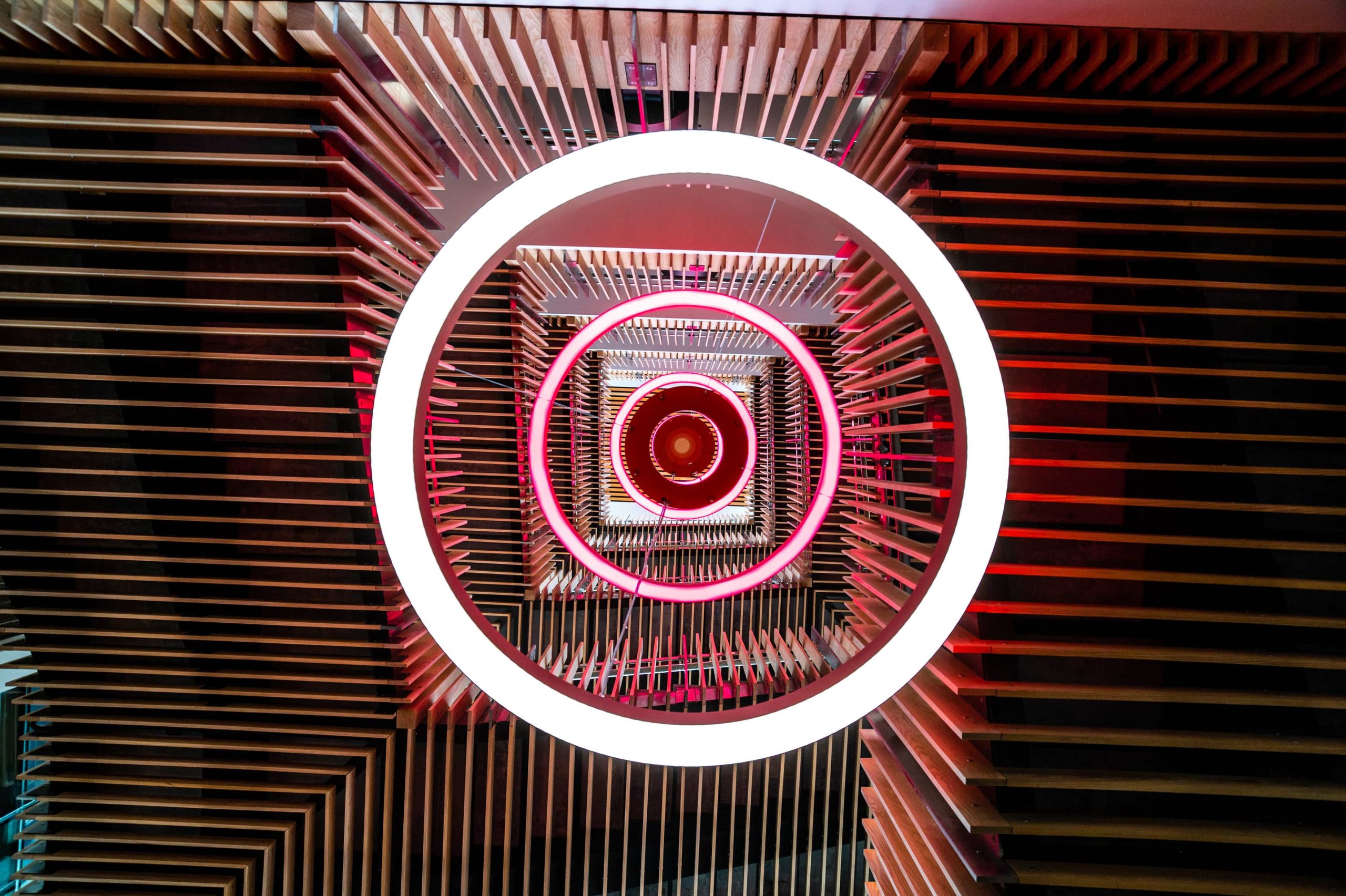 Our solution was to use the standalone DMX system used to control the atrium fittings but splitting into two separate universes; one for the atrium; and the other for the stair feature pendant. We added an interface capable of taking DMX signals and converting to DALI DT8, transmitting to the stair feature pendant via a dedicated DALI cable.