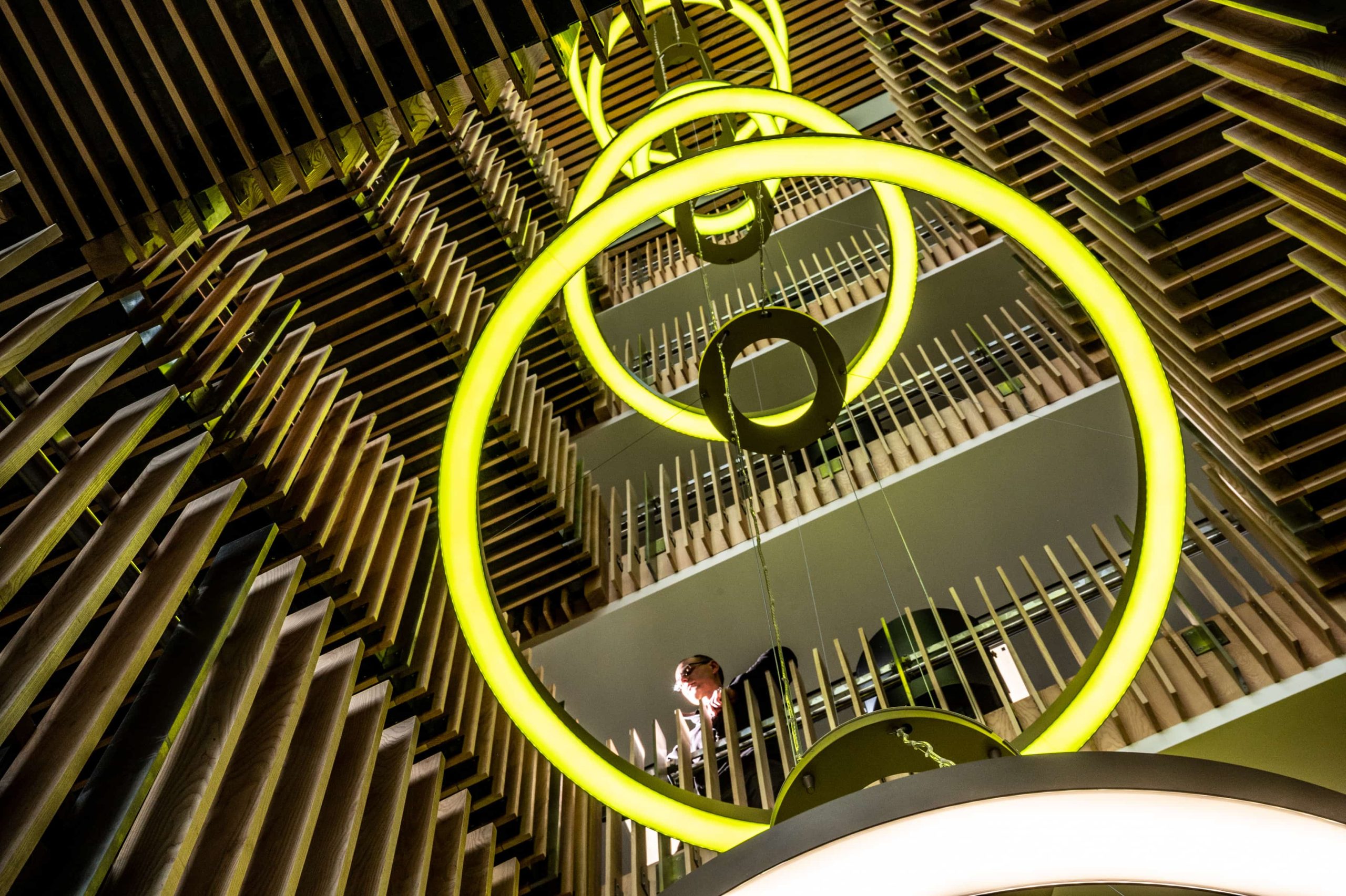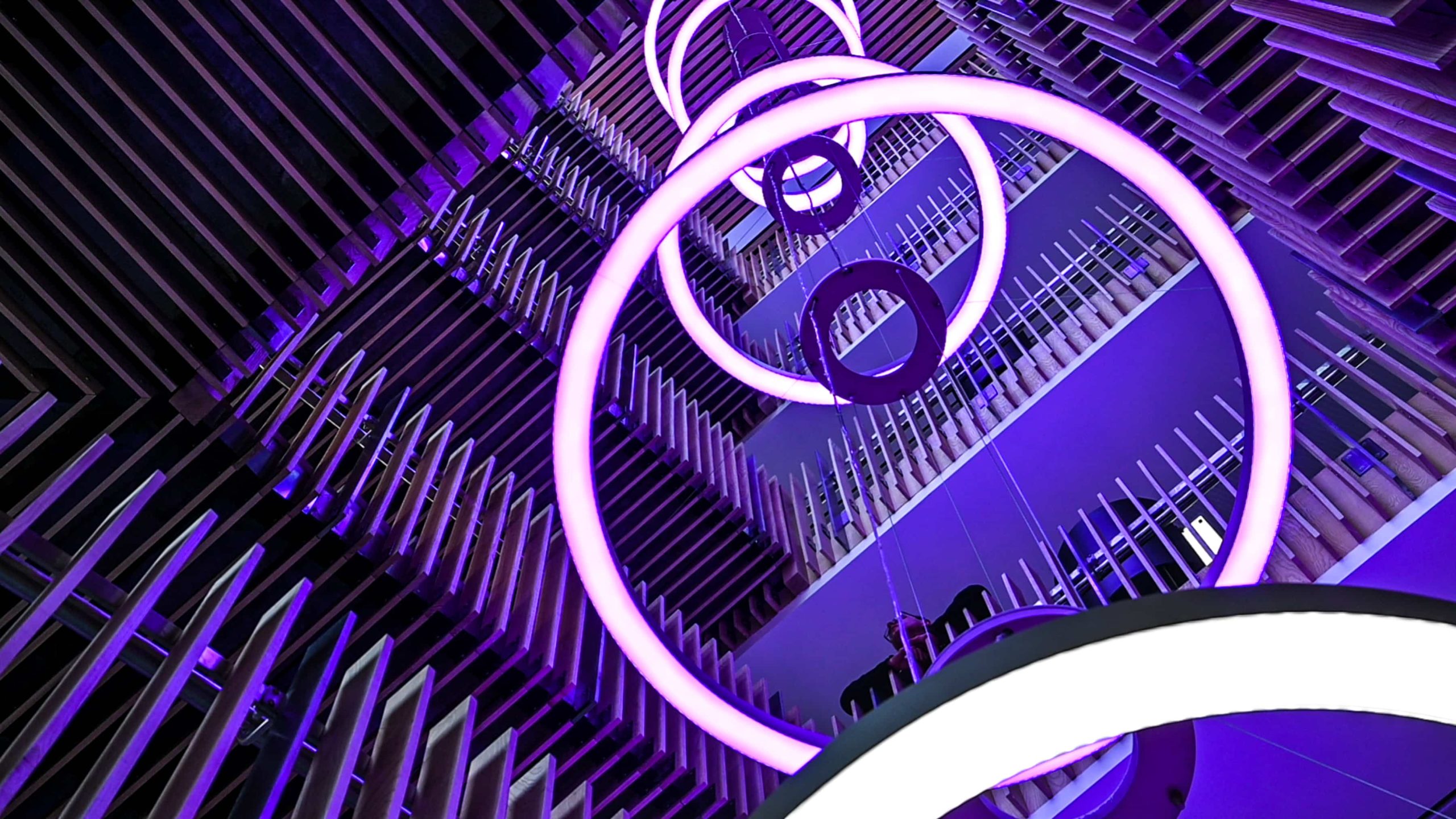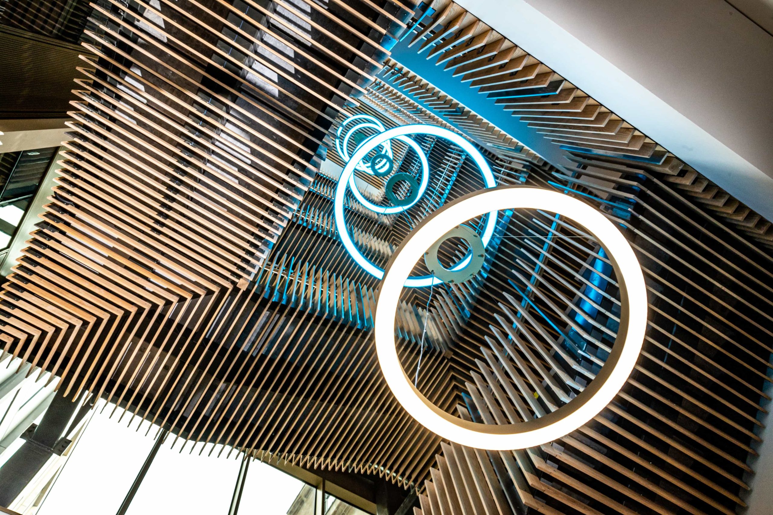 Once the control was arranged, the rest of the design and build went quite smoothly, including the stairwell feature pendant which were all RGBW direct and indirect. The exhibition space required several different sizes of suspended rings, with direct & indirect RGBW light with DALI control.
