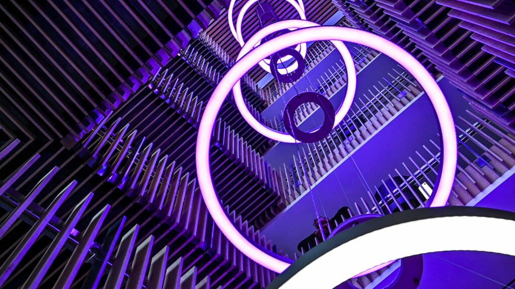 Another consideration was the indirect light detail which would be visible from above and needed to be diffused. We designed the FIGARO 100 to give diffused direct/indirect RGBW lighting, with independent up and down control. This was achieved with Casambi receivers and integral DMX drivers. We concluded the same profile could then be used for the feature stairwell pendant and the exhibition space suspended LED rings.