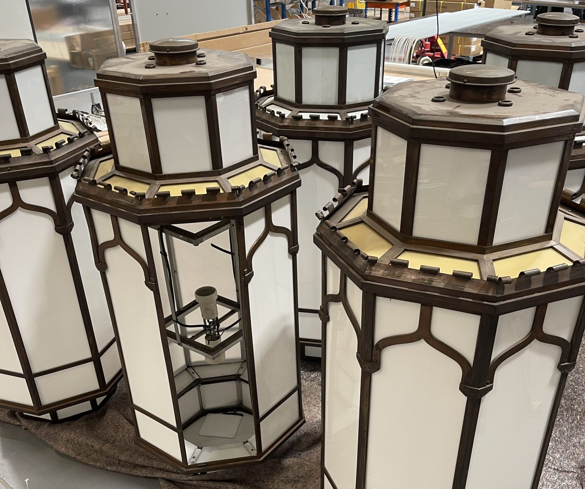 These luminaires have been restored and installed back in the historic hall. The new LEDs are 50% more energy efficient than the old halogen bulbs with twice the lumen output. They are now covered by our 5-year warranty which covers all parts and our labour, meaning the school can come back to us should they need any repair or maintenance work doing to the lanterns.