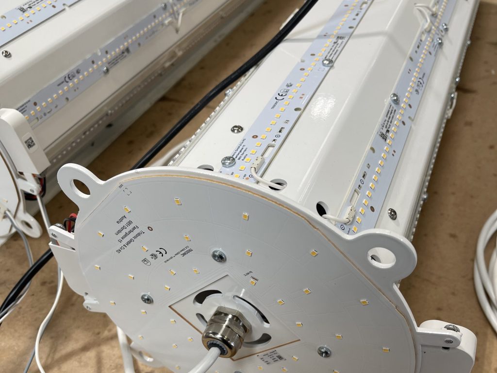 Our engineers designed a new retro-fit Aluminium gear tray to contain the new LEDs and drivers to bring these old lanterns back to their once former glory. Power consumption has been reduced from 800W down to 480W with the lumens now at 60,000, up significantly from the previous optimistic 30,000. The colour temperature of the LEDs is now at 4000K which is far more suitable for the luminaires in this environment and provides a much higher quality light for this multi purpose hall.