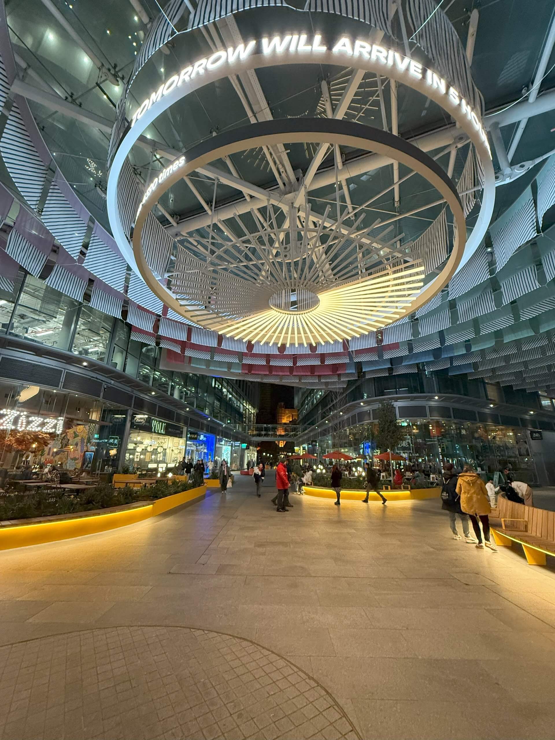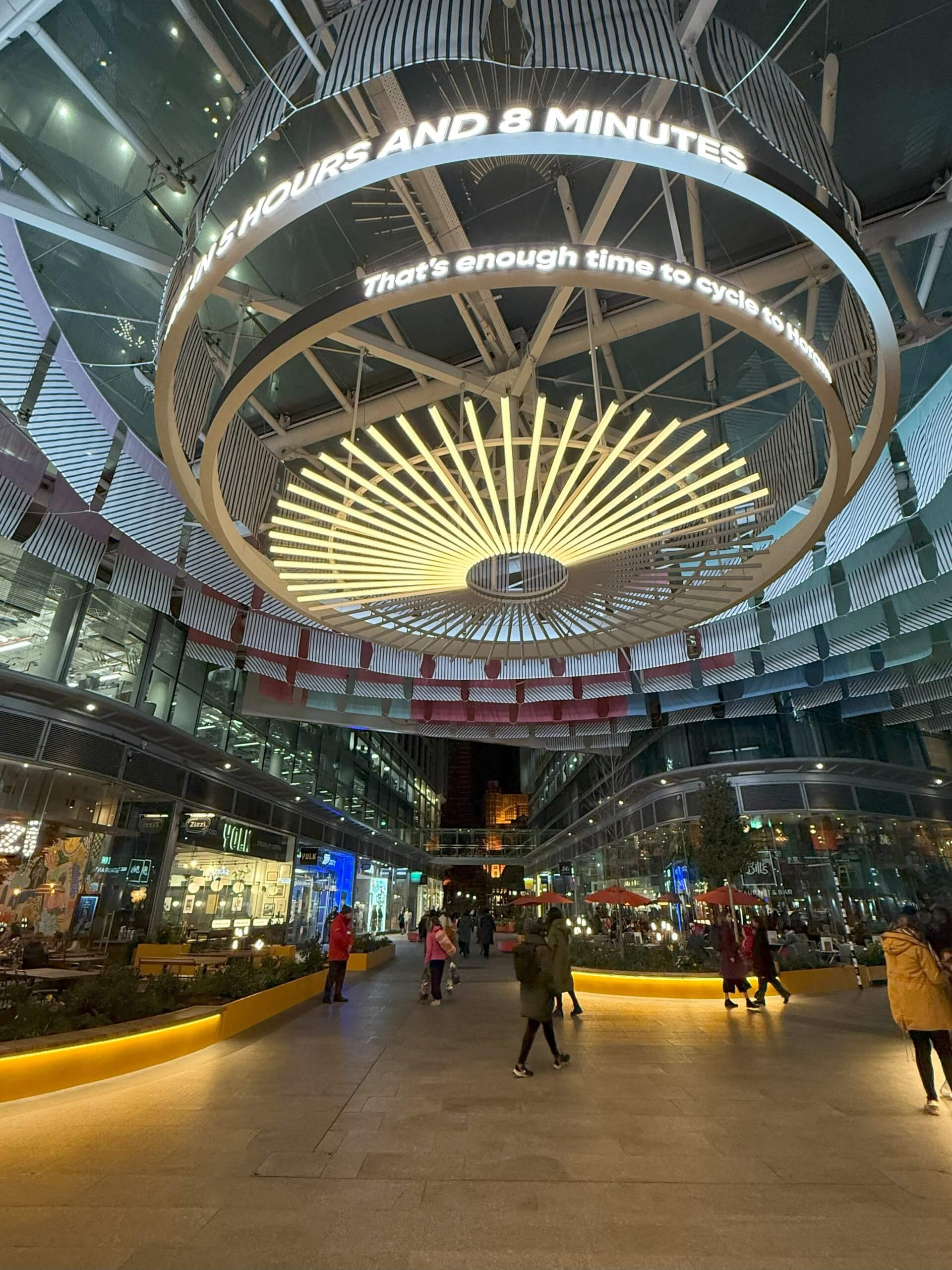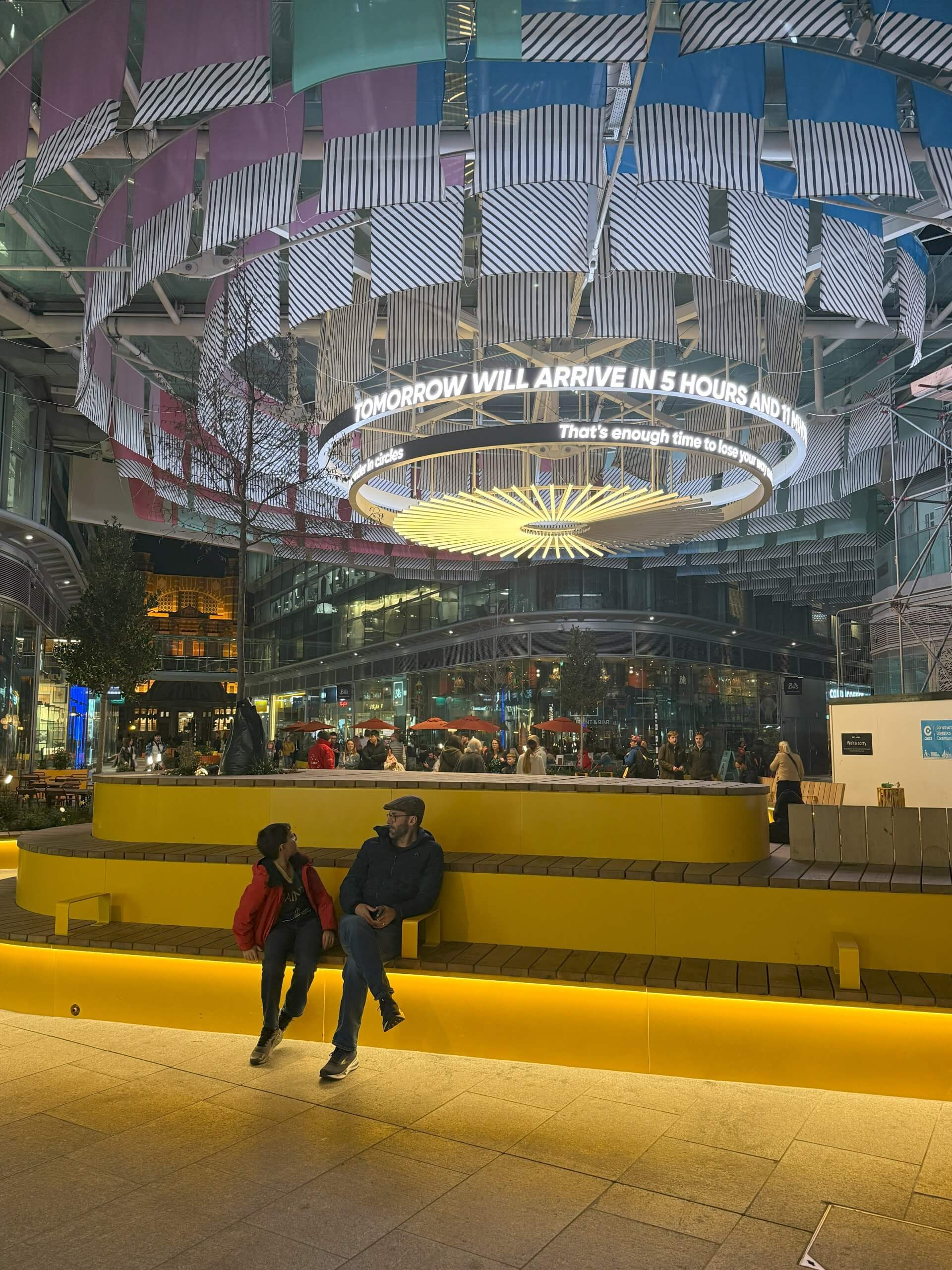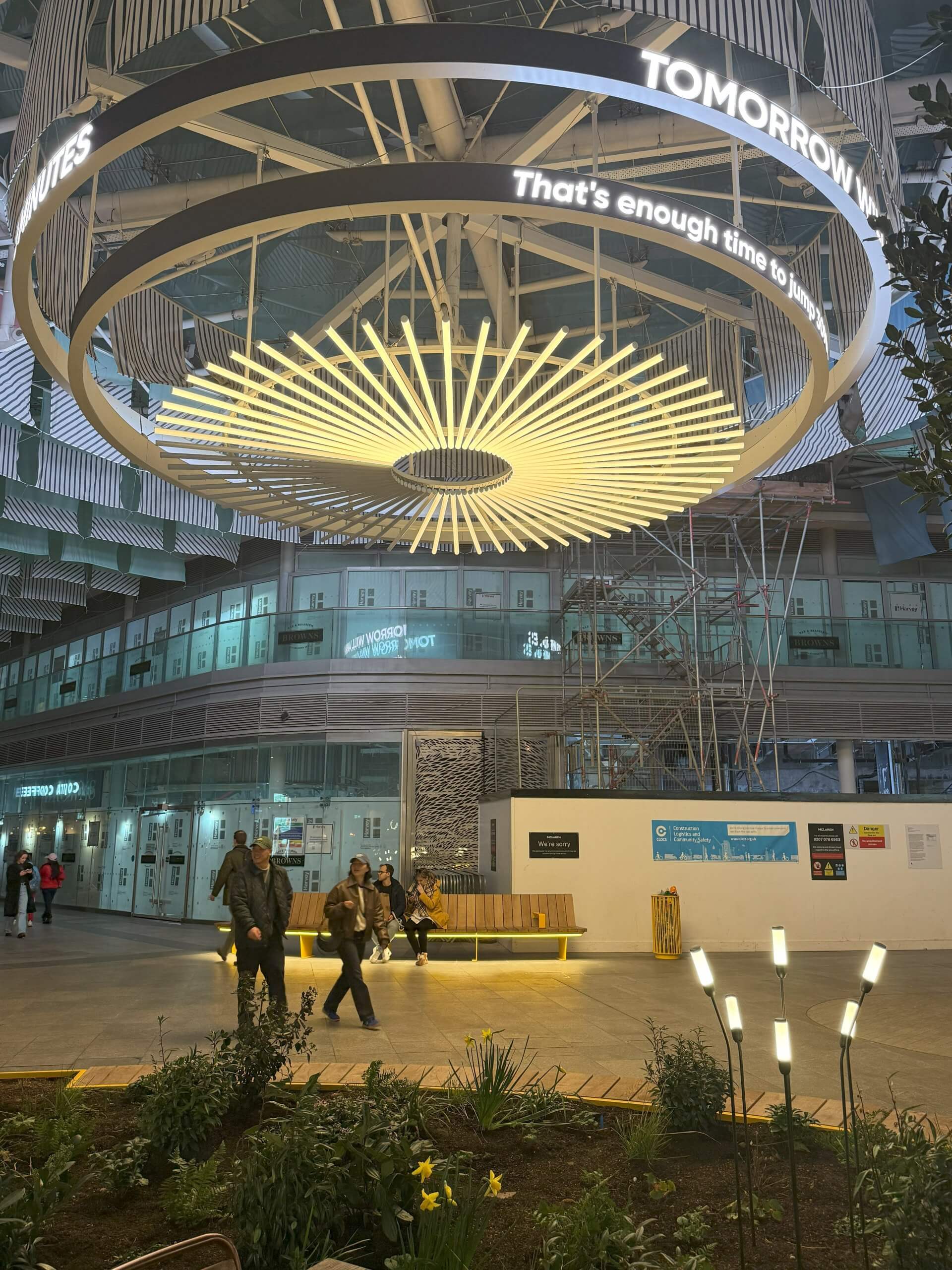 “Each of the 60 LED fixtures represents the passing of time which tie into Fabio’s revolving text displays. Each fitting represents each minute in the hour, or second in the minute with the use of light and movement of light to characterise time and the timeframes it takes to travel certain destinations from Cardinal Place”
