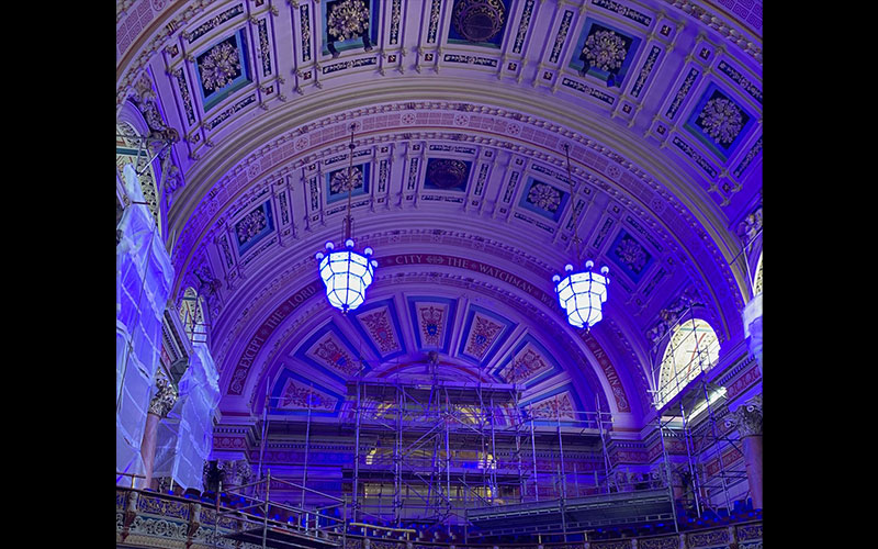 The hall, which is over 10 metres high, is used for all sorts of events from concerts to formal meetings. It was important to be able to set the right scenes appropriate to the event and the refurbished chandeliers will achieve this.