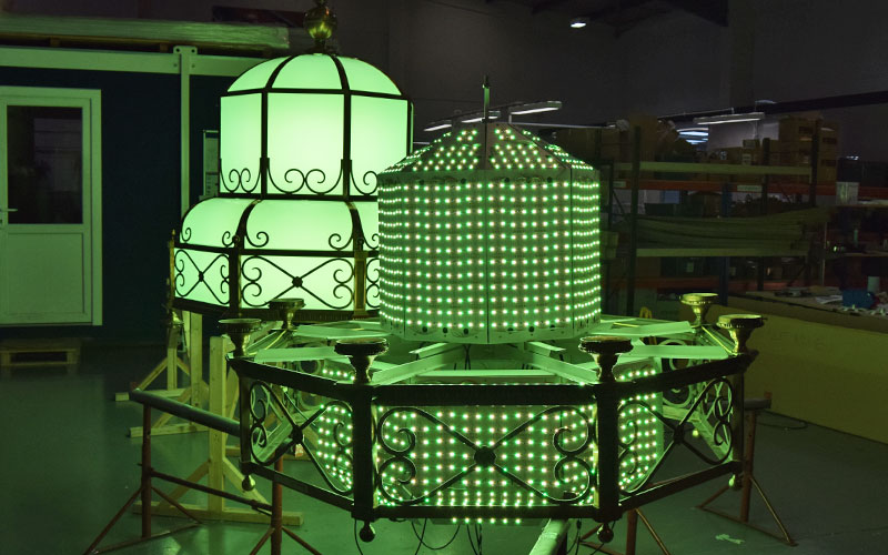 The chandeliers were first dismantled and the internal and external frames cleaned and refinished. While this work was in progress, both the bespoke LED modules and the specially fabricated chassis to hold them and their control gear were designed and manufactured.