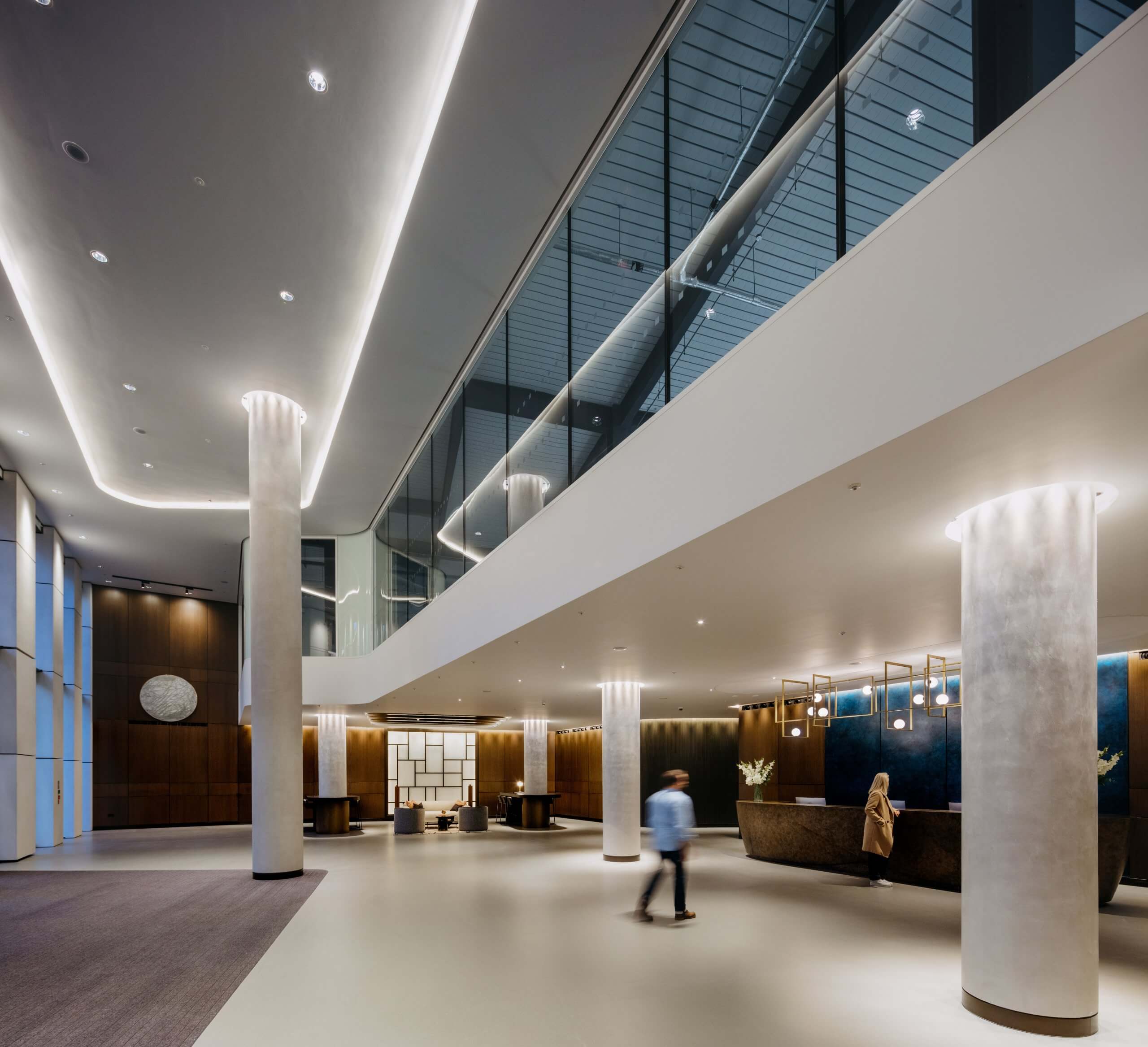 We had several of our products specified for this prestigious project which were used in various areas and floors throughout. Our Proteus LED was supplied for the furniture shelving in the foyer areas and within the ceiling coves for in-direct lighting where a seamless wash of light created an elegant effect. For the curved balustrades on the exterior balconies, our Flexus flexible 3000K linear LED has been installed and across the project our Alphaeus 3 4000K LED has been installed to up light the exterior facade. We also supplied the Lightnet Liquid Line 4000K suspended linear LED system to the 9th and 5th floor areas.
