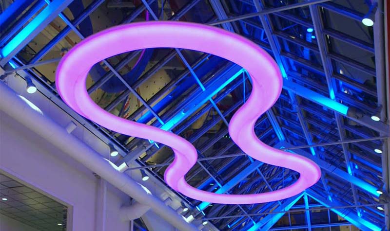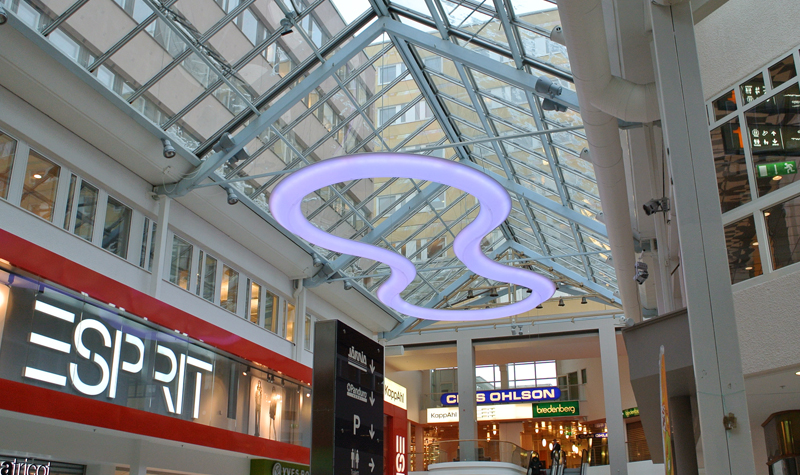 Studio Fractal designed a unique figure of eight feature that would be suspended from the atrium ceiling in Sweden’s Solna Shopping Mall. In the safe confidence that Kemps are experts at producing bespoke pieces, we were ultimately specified. The system we recommended spanned 5m x 12m and was constructed from 1.5mm white powder coated aluminium panels with two runs of internal RGB LEDs (Tri-chip Semi Soeul Conductor LED). These were controlled by a Mode Colourstyle to create eye-catching colour scenes throughout the day. To bring the creation to life, the full feature was wrapped in Barrisol translucent stretch fabric.