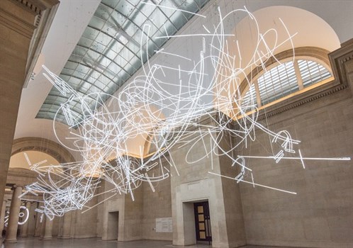 Forms in Space… by Light (in Time) has been created using 2kg of suspended neon lighting which forms a textured mass of hanging light. The brilliant-white structure snakes its way through the Duveen Galleries, animatedly throwing out shapes and symbols as it goes, like scribbles drawn in the air.